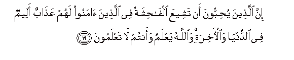 19. Inna allatheena yuhibboona an tasheeAAa alfahishatu fee allatheena amanoo lahum AAathabun aleemun fee alddunya waal-akhirati waAllahu yaAAlamu waantum la taAAlamoona