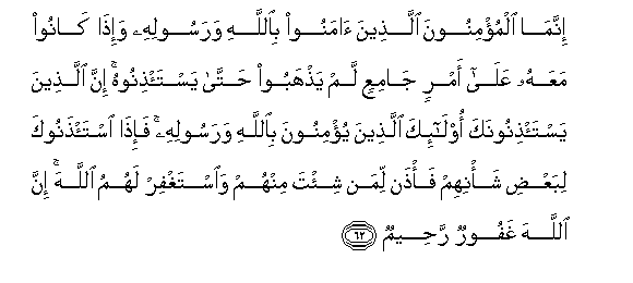 62. Innama almu/minoona allatheena amanoo biAllahi warasoolihi wa-itha kanoo maAAahu AAala amrin jamiAAin lam yathhaboo hatta yasta/thinoohu inna allatheena yasta/thinoonaka ola-ika allatheena yu/minoona biAllahi warasoolihi fa-itha ista/thanooka libaAAdi sha/nihim fa/than liman shi/ta minhum waistaghfir lahumu Allaha inna Allaha ghafoorun raheemun