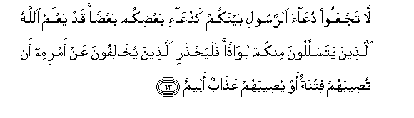 63. Deem not the summons of the Messenger among yourselves like the summons of one of you to another: Allah doth know those of you who slip away under shelter of some excuse: then let those beware who withstand the Messenger's order, lest some trial befall them, or a grievous penalty be inflicted on them.