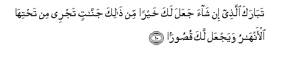10. Tabaraka allathee in shaa jaAAala laka khayran min thalika jannatin tajree min tahtiha al-anharu wayajAAal laka qusooran