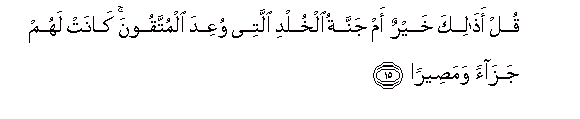 15. Qul athalika khayrun am jannatu alkhuldi allatee wuAAida almuttaqoona kanat lahum jazaan wamaseeran