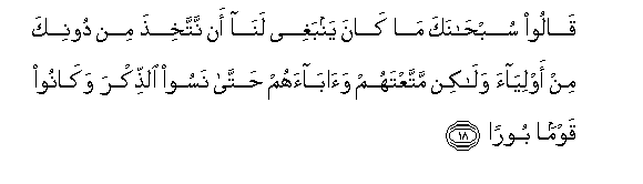 18. Qaloo subhanaka ma kana yanbaghee lana an nattakhitha min doonika min awliyaa walakin mattaAAtahum waabaahum hatta nasoo alththikra wakanoo qawman booran