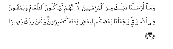 20. Wama arsalna qablaka mina almursaleena illa innahum laya/kuloona alttaAAama wayamshoona fee al-aswaqi wajaAAalna baAAdakum libaAAdin fitnatan atasbiroona wakana rabbuka baseeran