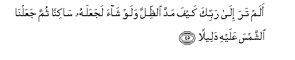 45. Alam tara ila rabbika kayfa madda alththilla walaw shaa lajaAAalahu sakinan thumma jaAAalna alshshamsa AAalayhi daleelan