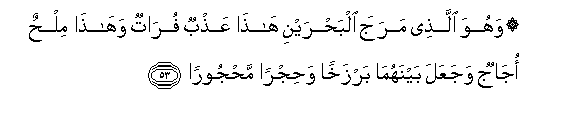 53. Wahuwa allathee maraja albahrayni hatha AAathbun furatun wahatha milhun ojajun wajaAAala baynahuma barzakhan wahijran mahjooran