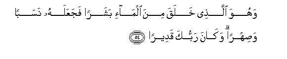 54. It is He Who has created man from water: then has He established relationships of lineage and marriage: for thy Lord has power (over all things).