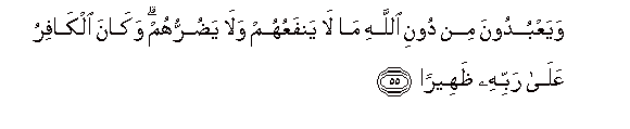 55. WayaAAbudoona min dooni Allahi ma la yanfaAAuhum wala yadurruhum wakana alkafiru AAala rabbihi thaheeran