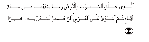 59. Allathee khalaqa alssamawati waal-arda wama baynahuma fee sittati ayyamin thumma istawa AAala alAAarshi alrrahmanu fais-al bihi khabeeran
