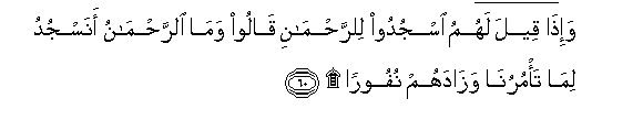 60. Wa-itha qeela lahumu osjudoo lilrrahmani qaloo wama alrrahmanu anasjudu lima ta/muruna wazadahum nufooran