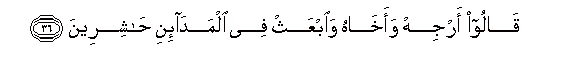 36. Qaloo arjih waakhahu waibAAath fee almada-ini hashireena
