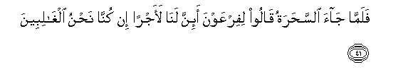 41. Falamma jaa alssaharatu qaloo lifirAAawna a-inna lana laajran in kunna nahnu alghalibeena