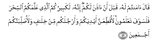 49. Qala amantum lahu qabla an athana lakum innahu lakabeerukumu allathee AAallamakumu alssihra falasawfa taAAlamoona laoqattiAAanna aydiyakum waarjulakum min khilafin walaosallibannakum ajmaAAeena