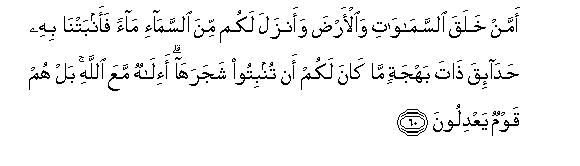 60. Amman khalaqa alssamawati waal-arda waanzala lakum mina alssama-i maan faanbatna bihi hada-iqa thata bahjatin ma kana lakum an tunbitoo shajaraha a-ilahun maAAa Allahi bal hum qawmun yaAAdiloona