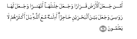 61. Amman jaAAala al-arda qararan wajaAAala khilalaha anharan wajaAAala laha rawasiya wajaAAala bayna albahrayni hajizan a-ilahun maAAa Allahi bal aktharuhum la yaAAlamoona