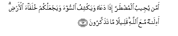 62. Amman yujeebu almudtarra itha daAAahu wayakshifu alssoo-a wayajAAalukum khulafaa al-ardi a-ilahun maAAa Allahi qaleelan ma tathakkaroona