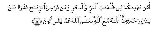 63. Amman yahdeekum fee thulumati albarri waalbahri waman yursilu alrriyaha bushran bayna yaday rahmatihi a-ilahun maAAa Allahi taAAala Allahu AAamma yushrikoona