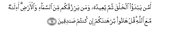 64. Amman yabdao alkhalqa thumma yuAAeeduhu waman yarzuqukum mina alssama-i waal-ardi a-ilahun maAAa Allahi qul hatoo burhanakum in kuntum sadiqeena