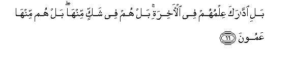 66. Bali iddaraka AAilmuhum fee al-akhirati bal hum fee shakkin minha bal hum minha AAamoona
