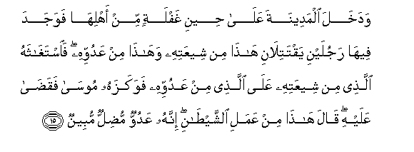 15. Wadakhala almadeenata AAala heeni ghaflatin min ahliha fawajada feeha rajulayni yaqtatilani hatha min sheeAAatihi wahatha min AAaduwwihi faistaghathahu allathee min sheeAAatihi AAala allathee min AAaduwwihi fawakazahu moosa faqada AAalayhi qala hatha min AAamali alshshaytani innahu AAaduwwun mudillun mubeenun