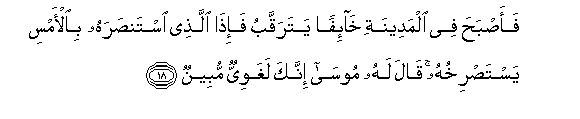 18. Faasbaha fee almadeenati kha-ifan yataraqqabu fa-itha allathee istansarahu bial-amsi yastasrikhuhu qala lahu moosa innaka laghawiyyun mubeenun