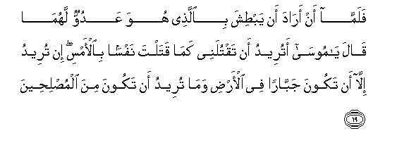 19. Falamma an arada an yabtisha biallathee huwa AAaduwwun lahuma qala ya moosa atureedu an taqtulanee kama qatalta nafsan bial-amsi in tureedu illa an takoona jabbaran fee al-ardi wama tureedu an takoona mina almusliheena