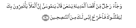20. Wajaa rajulun min aqsa almadeenati yasAAa qala ya moosa inna almalaa ya/tamiroona bika liyaqtulooka faokhruj innee laka mina alnnasiheena