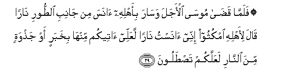 29. Falamma qada moosa al-ajala wasara bi-ahlihi anasa min janibi alttoori naran qala li-ahlihi omkuthoo innee anastu naran laAAallee ateekum minha bikhabarin aw jathwatin mina alnnari laAAallakum tastaloona