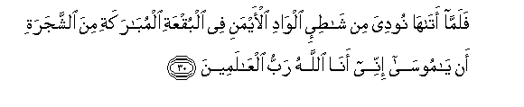30. Falamma ataha noodiya min shati-i alwadi al-aymani fee albuqAAati almubarakati mina alshshajarati an ya moosa innee ana Allahu rabbu alAAalameena