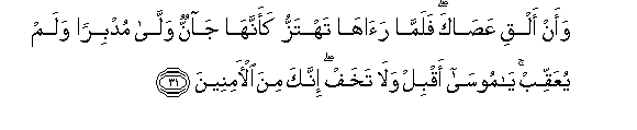 31. Waan alqi AAasaka falamma raaha tahtazzu kaannaha jannun walla mudbiran walam yuAAaqqib ya moosa aqbil wala takhaf innaka mina al-amineena