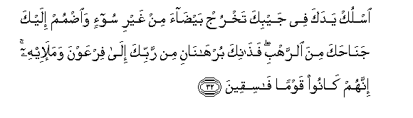 32. Osluk yadaka fee jaybika takhruj baydaa min ghayri soo-in waodmum ilayka janahaka mina alrrahbi fathanika burhanani min rabbika ila firAAawna wamala-ihi innahum kanoo qawman fasiqeena