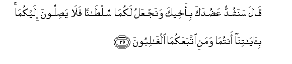 35. Qala sanashuddu AAadudaka bi-akheeka wanajAAalu lakuma sultanan fala yasiloona ilaykuma bi-ayatina antuma wamani ittabaAAakuma alghaliboona