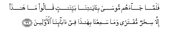 36. Falamma jaahum moosa bi-ayatina bayyinatin qaloo ma hatha illa sihrun muftaran wama samiAAna bihatha fee aba-ina al-awwaleena