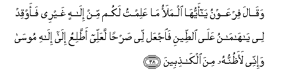 38. Waqala firAAawnu ya ayyuha almalao ma AAalimtu lakum min ilahin ghayree faawqid lee ya hamanu AAala altteeni faijAAal lee sarhan laAAallee attaliAAu ila ilahi moosa wa-innee laathunnuhu mina alkathibeena