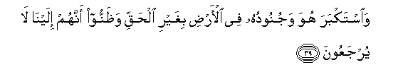 39. Waistakbara huwa wajunooduhu fee al-ardi bighayri alhaqqi wathannoo annahum ilayna la yurjaAAoona