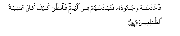 40. Faakhathnahu wajunoodahu fanabathnahum fee alyammi faonthur kayfa kana AAaqibatu alththalimeena