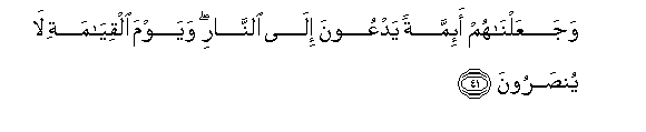 41. WajaAAalnahum a-immatan yadAAoona ila alnnari wayawma alqiyamati la yunsaroona