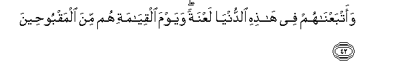 42. WaatbaAAnahum fee hathihi alddunya laAAnatan wayawma alqiyamati hum mina almaqbooheena
