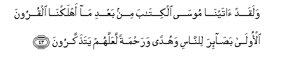 43. Walaqad atayna moosa alkitaba min baAAdi ma ahlakna alquroona al-oola basa-ira lilnnasi wahudan warahmatan laAAallahum yatathakkaroona