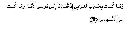 44. Wama kunta bijanibi algharbiyyi ith qadayna ila moosa al-amra wama kunta mina alshshahideena