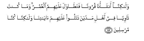 45. Walakinna ansha-na quroonan fatatawala AAalayhimu alAAumuru wama kunta thawiyan fee ahli madyana tatloo AAalayhim ayatina walakinna kunna mursileena