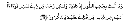 46. Wama kunta bijanibi alttoori ith nadayna walakin rahmatan min rabbika litunthira qawman ma atahum min natheerin min qablika laAAallahum yatathakkaroona