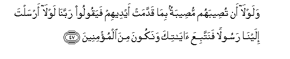 47. Walawla an tuseebahum museebatun bima qaddamat aydeehim fayaqooloo rabbana lawla arsalta ilayna rasoolan fanattabiAAa ayatika wanakoona mina almu/mineena