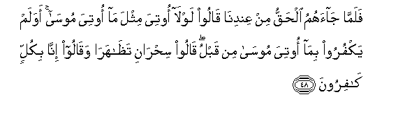 48. But (now), when the Truth has come to them from Ourselves, they say, "Why are not (Signs) sent to him, like those which were sent to Moses?" Do they not then reject (the Signs) which were formerly sent to Moses? They say: "Two kinds of sorcery, each assisting the other!" And they say: "For us, we reject all (such things)!"