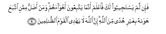 50. Fa-in lam yastajeeboo laka faiAAlam annama yattabiAAoona ahwaahum waman adallu mimmani ittabaAAa hawahu bighayri hudan mina Allahi inna Allaha la yahdee alqawma alththalimeena