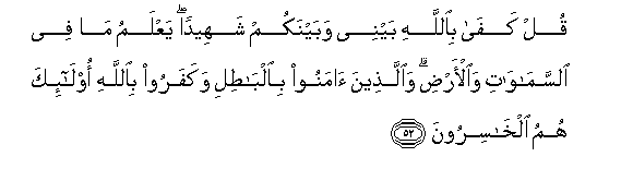 52. Qul kafa biAllahi baynee wabaynakum shaheedan yaAAlamu ma fee alssamawati waal-ardi waallatheena amanoo bialbatili wakafaroo biAllahi ola-ika humu alkhasiroona