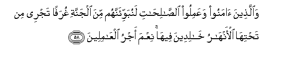 58. Waallatheena amanoo waAAamiloo alssalihati lanubawwi-annahum mina aljannati ghurafan tajree min tahtiha al-anharu khalideena feeha niAAma ajru alAAamileena