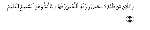 60. Wakaayyin min dabbatin la tahmilu rizqaha Allahu yarzuquha wa-iyyakum wahuwa alssameeAAu alAAaleemu
