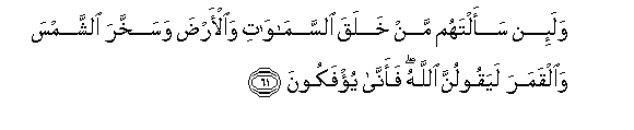 61. Wala-in saaltahum man khalaqa alssamawati waal-arda wasakhkhara alshshamsa waalqamara layaqoolunna Allahu faanna yu/fakoona