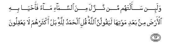 63. Wala-in saaltahum man nazzala mina alssama-i maan faahya bihi al-arda min baAAdi mawtiha layaqoolunna Allahu quli alhamdu lillahi bal aktharuhum la yaAAqiloona