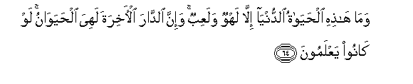 64. Wama hathihi alhayatu alddunya illa lahwun walaAAibun wa-inna alddara al-akhirata lahiya alhayawanu law kanoo yaAAlamoona